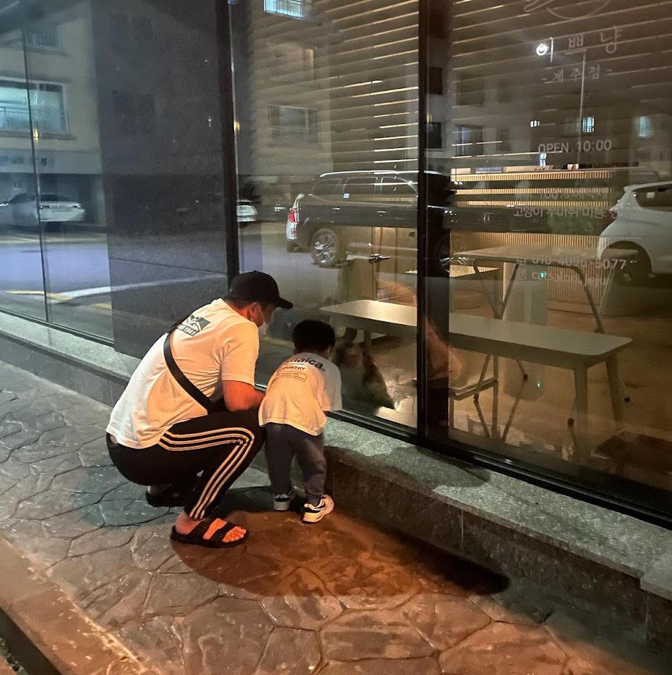 퇴근한 아빠랑 저녁으로 고기 먹고 동네 산책하다가