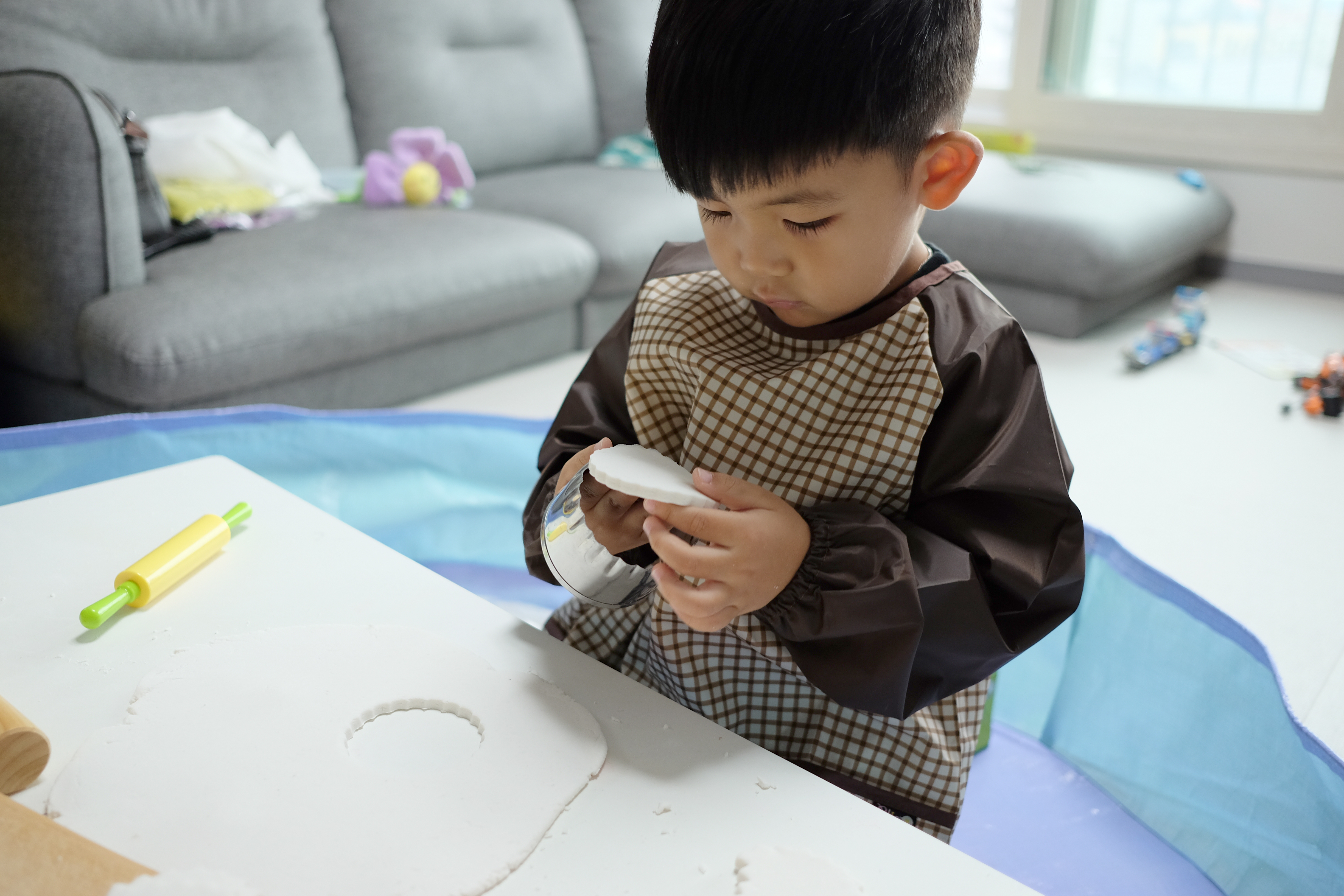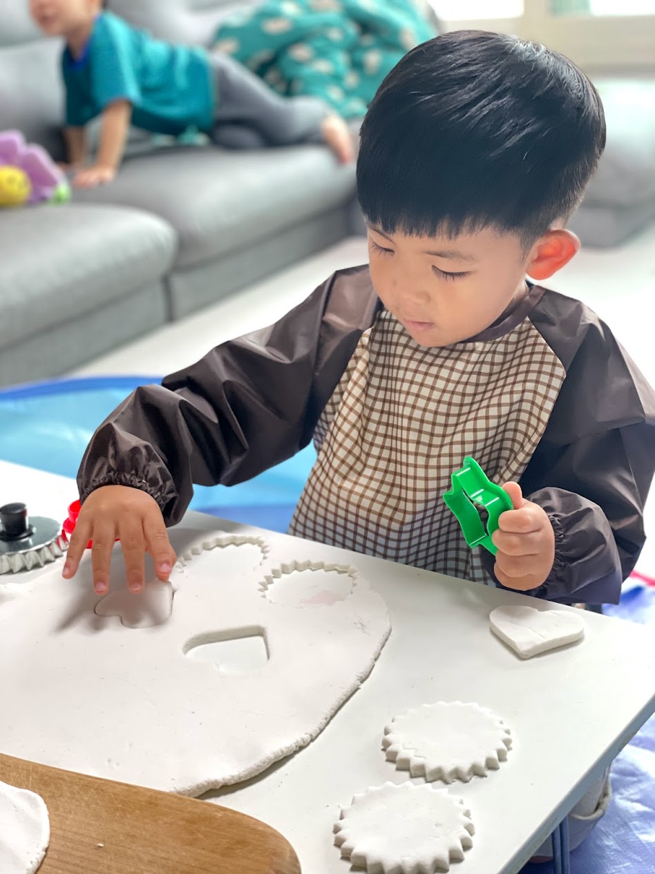 놀이매트 깔고 반죽하고 미술가운 입고 모양찍고 !