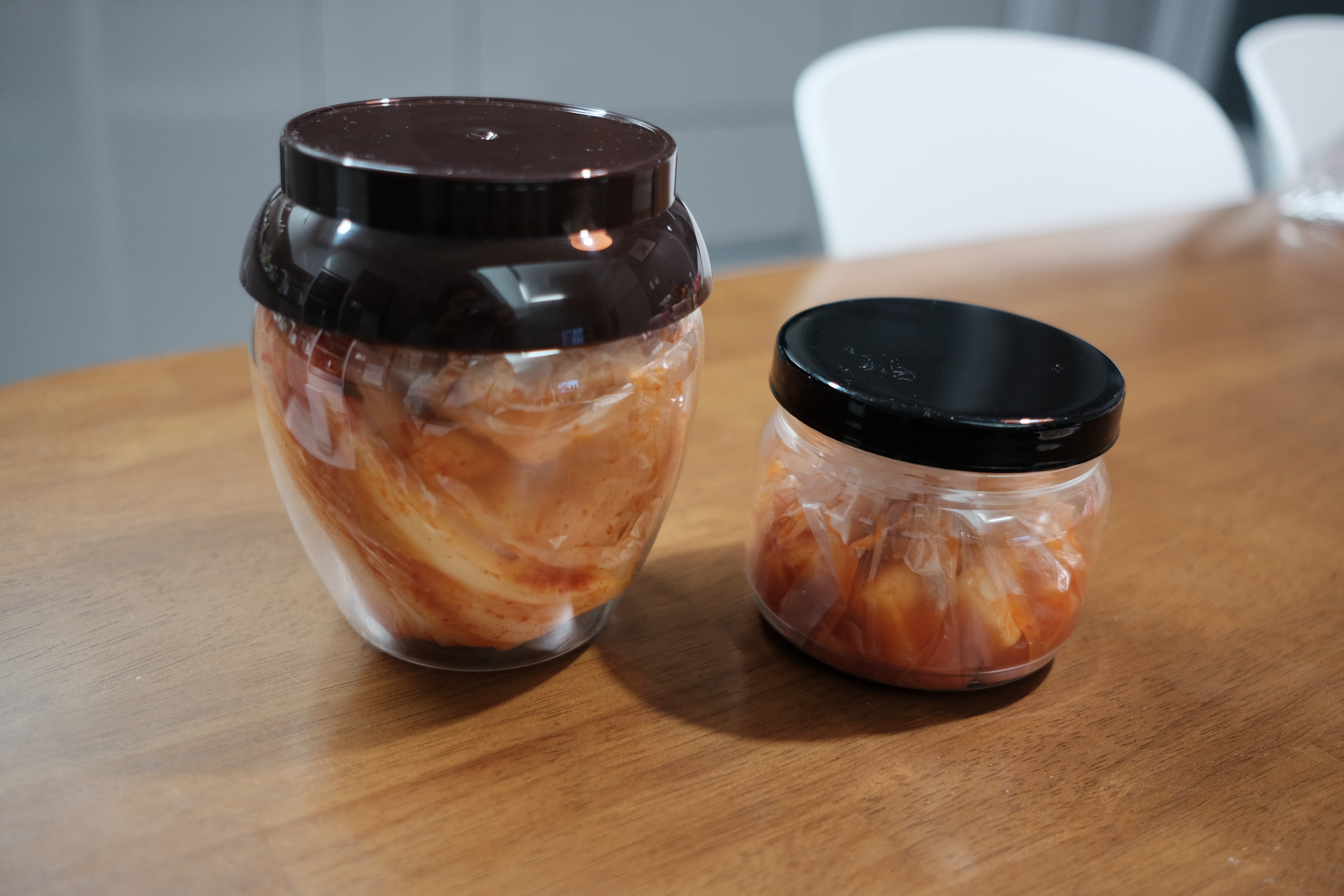 직접 담근 배추김치와 깍두기를 가져왔다.