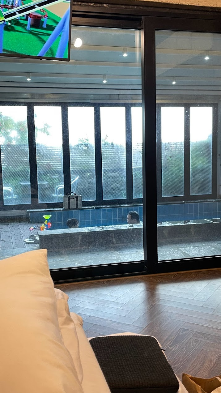 방이랑 통창으로 연결된 수영장과 바베큐장.
